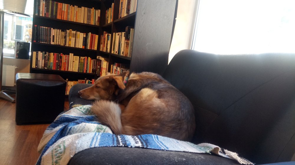 Especially if they have a comfortable armchair and sunny windows. I discovered in my neighborhood an English bookstore. A second-hand book stores. The Munich Readery. With a comfortable armchair. Good chocolate. Sunny windows. And a sleeping dog. It is the first book-store dog that I ever saw. And above all these colorful and special details, you have huge shelves full of good books. Storybooks, fiction, biographies, phantasies, thematically books. It was hard to stop at buying only two books. Beyond the books and a friendly owner which is one ant the same person with the seller, the library offers a lot of activities. In English. But I will write you a separate postcard about it. Until next time….
